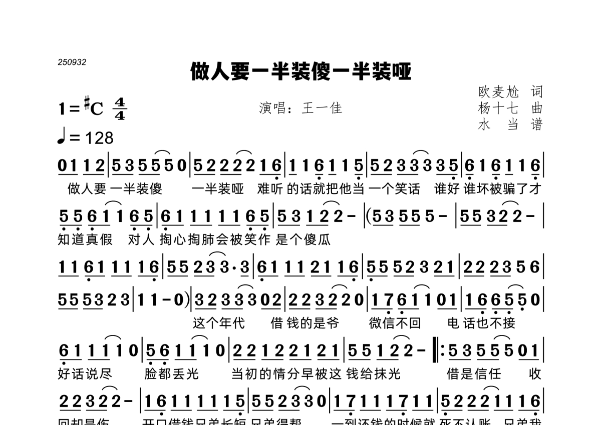 《做人要一半装傻一半装哑》是王一佳演唱的一首歌曲,拍号为4/4拍,歌曲速度为每分钟128拍,这份简谱共有一张高清图谱,图谱由 @水当 编配上传。