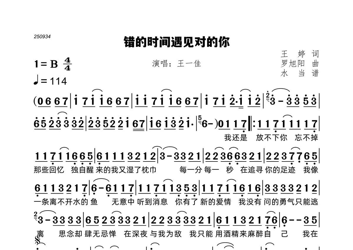 错的时间遇见对的你简谱 - 王一佳演唱