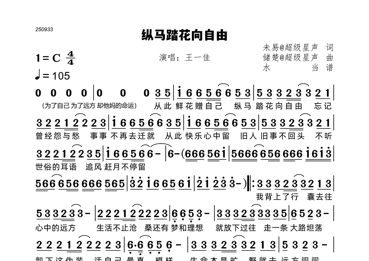 《纵马踏花向自由》是王一佳演唱的一首歌曲,拍号为4/4拍,歌曲速度为每分钟105拍,这份简谱共有一张高清图谱,图谱由 @水当 编配上传。