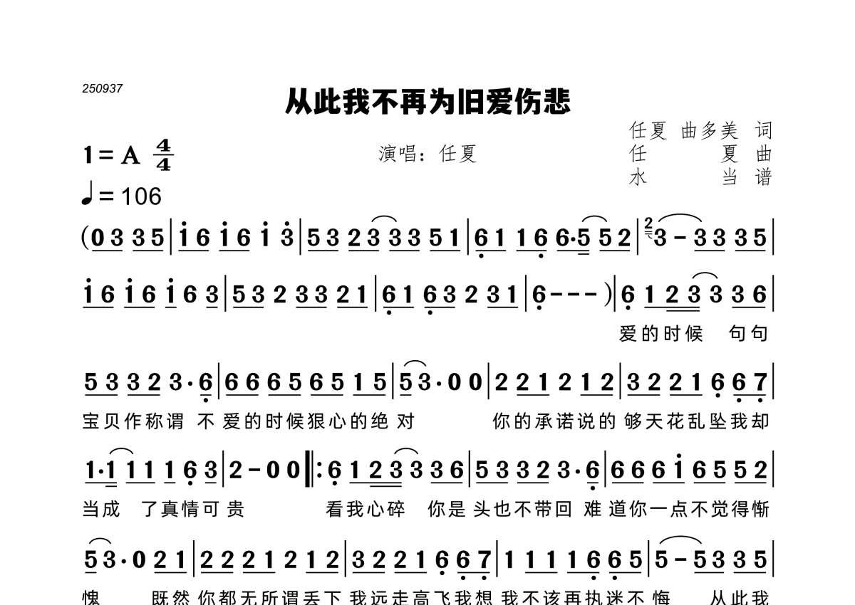 从此我不再为旧爱伤悲简谱 - 任夏演唱
