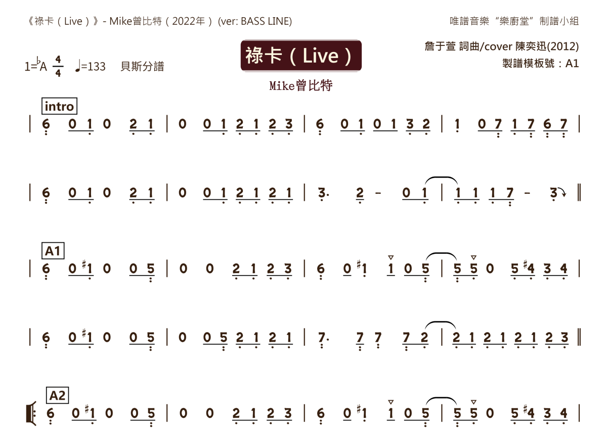 mike曾比特《禄卡(Live)【贝斯分谱完整版】》乐队总谱 - 贝斯分谱完整版