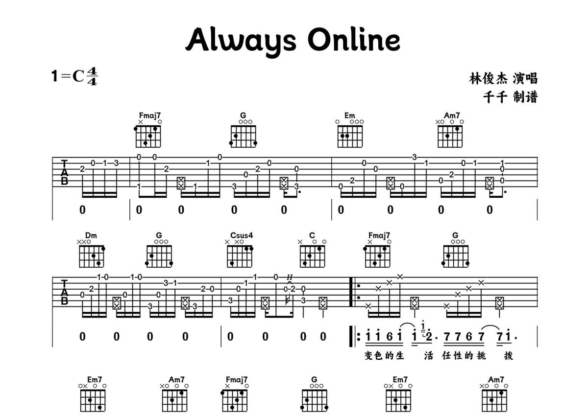 Always Online吉他谱 - 林俊杰演唱 - C调弹唱六线谱