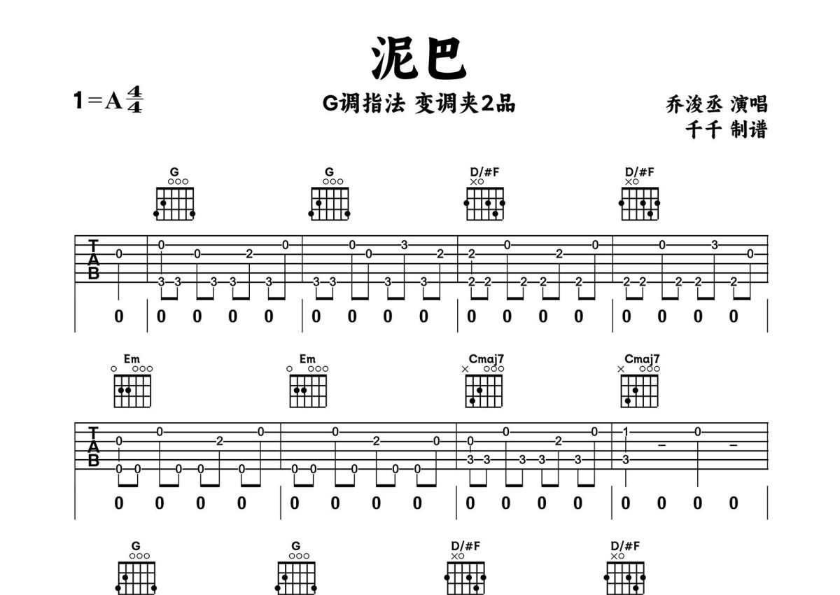 《泥巴》是乔浚丞演唱的一首歌曲,拍号为4/4拍,歌曲原调为A调,但由于原调指法比较难,为了方便弹奏,本吉他谱采用的是G调指法编配,变调夹2品弹奏即为原调,当然也可以根据自己的音域改变变调夹位置,或者通过改变和弦调性,以方便自己弹奏,这份吉他谱共有四张高清图谱,图谱由 @千千 编配上传,图谱使用六线谱编配,包含吉他和弦指法、简谱以及歌词部分,使用这份泥巴吉他谱,可以让你更加方便地掌握这首歌曲的弹唱技巧,快来尝试吧。