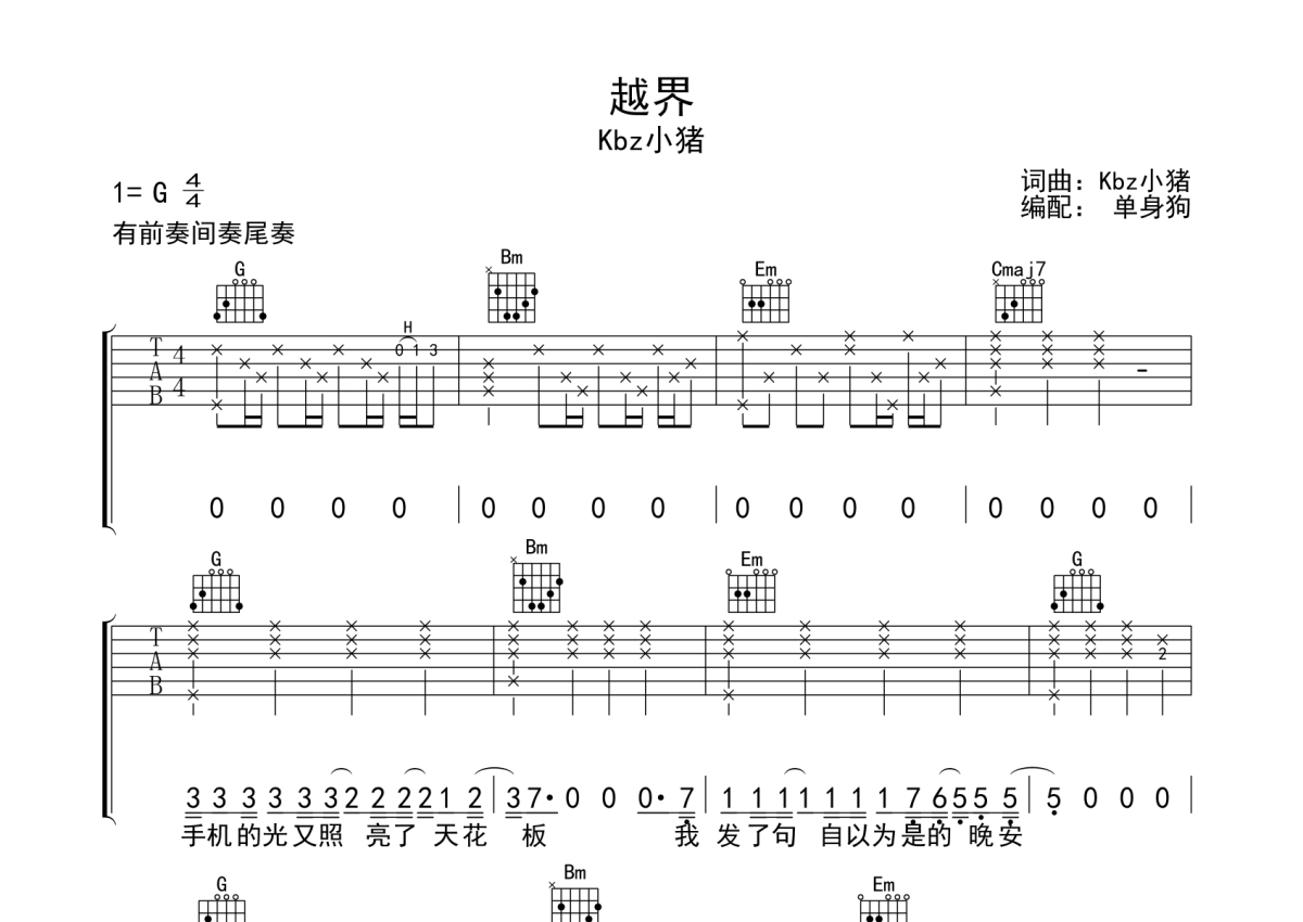 Kbz小猪《越界》吉他谱 - G调弹唱六线谱