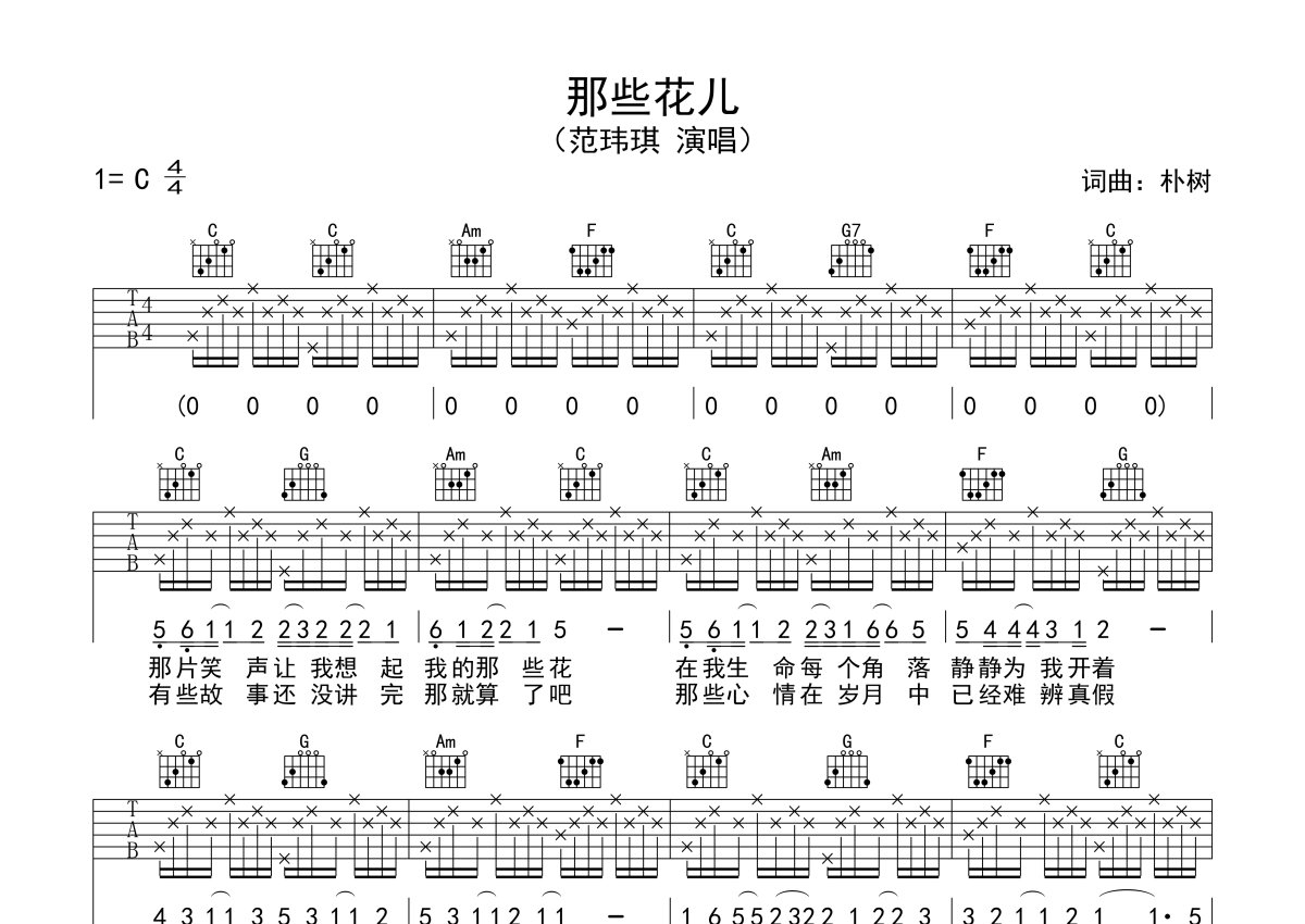 范玮琪/朴树《那些花儿》吉他谱 - C调弹唱六线谱