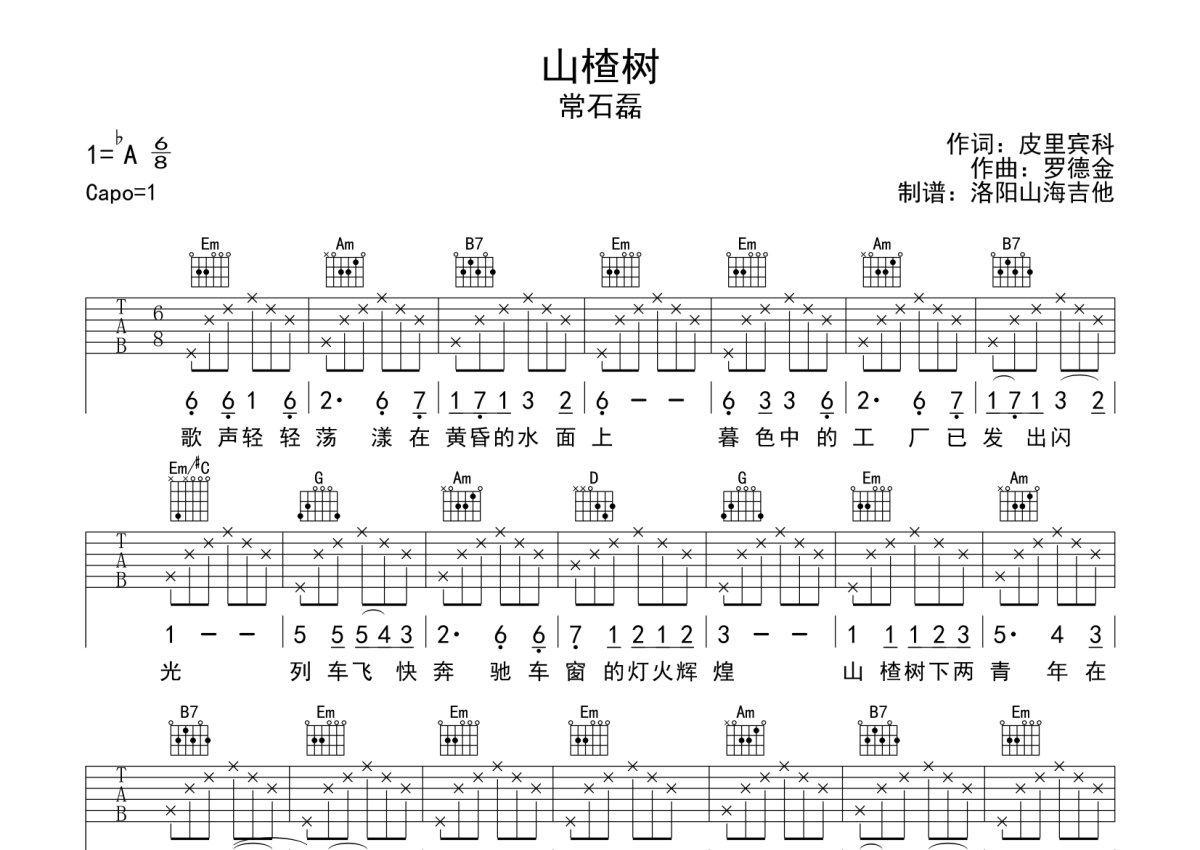 《山楂树》是常石磊演唱的一首歌曲,本吉他谱采用的是G调指法编配,这份吉他谱共有一张高清图谱,图谱由 @何奔洋 编配上传,图谱使用六线谱编配,包含吉他和弦指法、简谱以及歌词部分,曲谱配备了相关的音频提供试听,使用这份山楂树吉他谱,可以让你更加方便地掌握这首歌曲的弹唱技巧,快来尝试吧。
