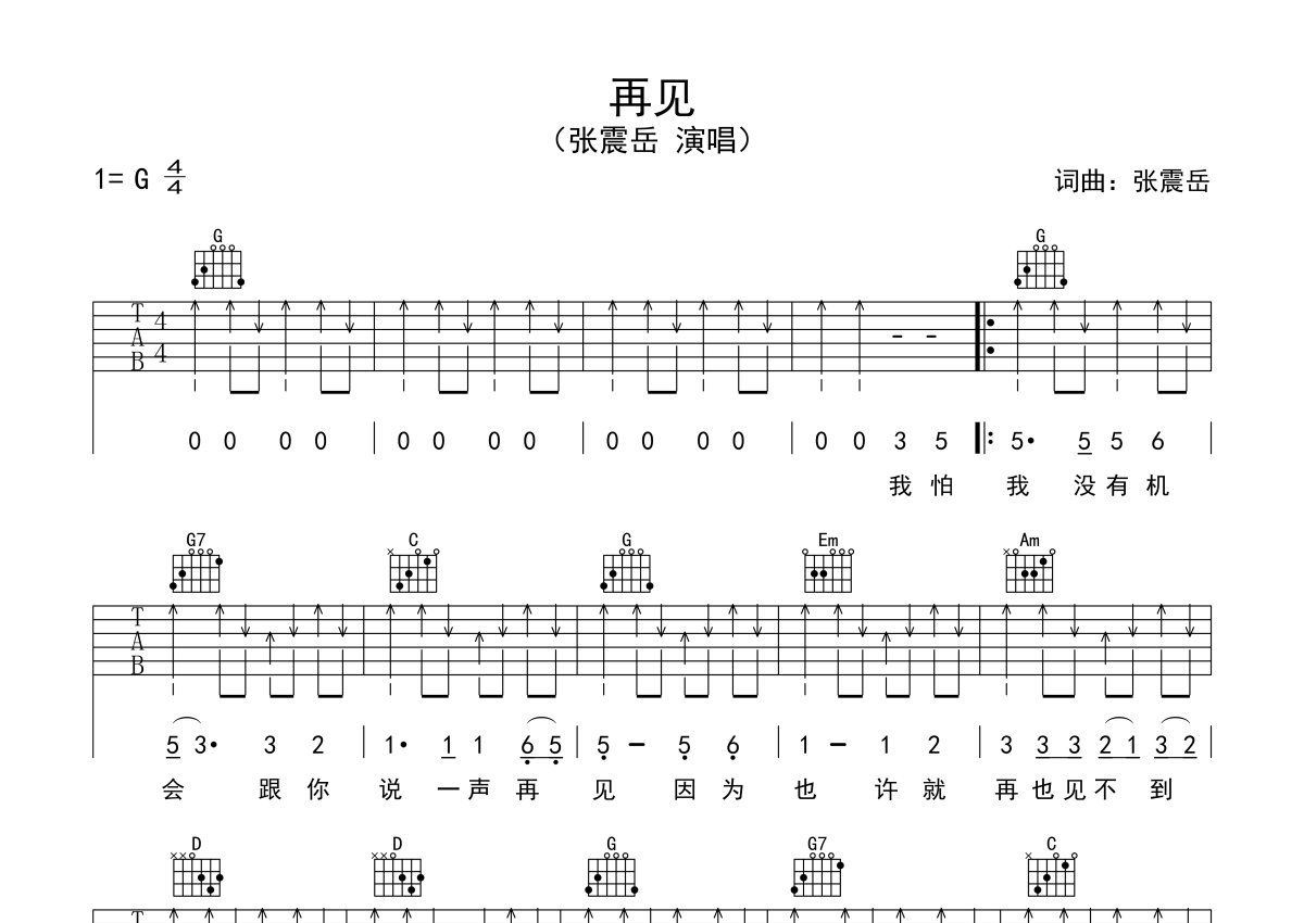 张震岳《再见》吉他谱 - G调弹唱六线谱