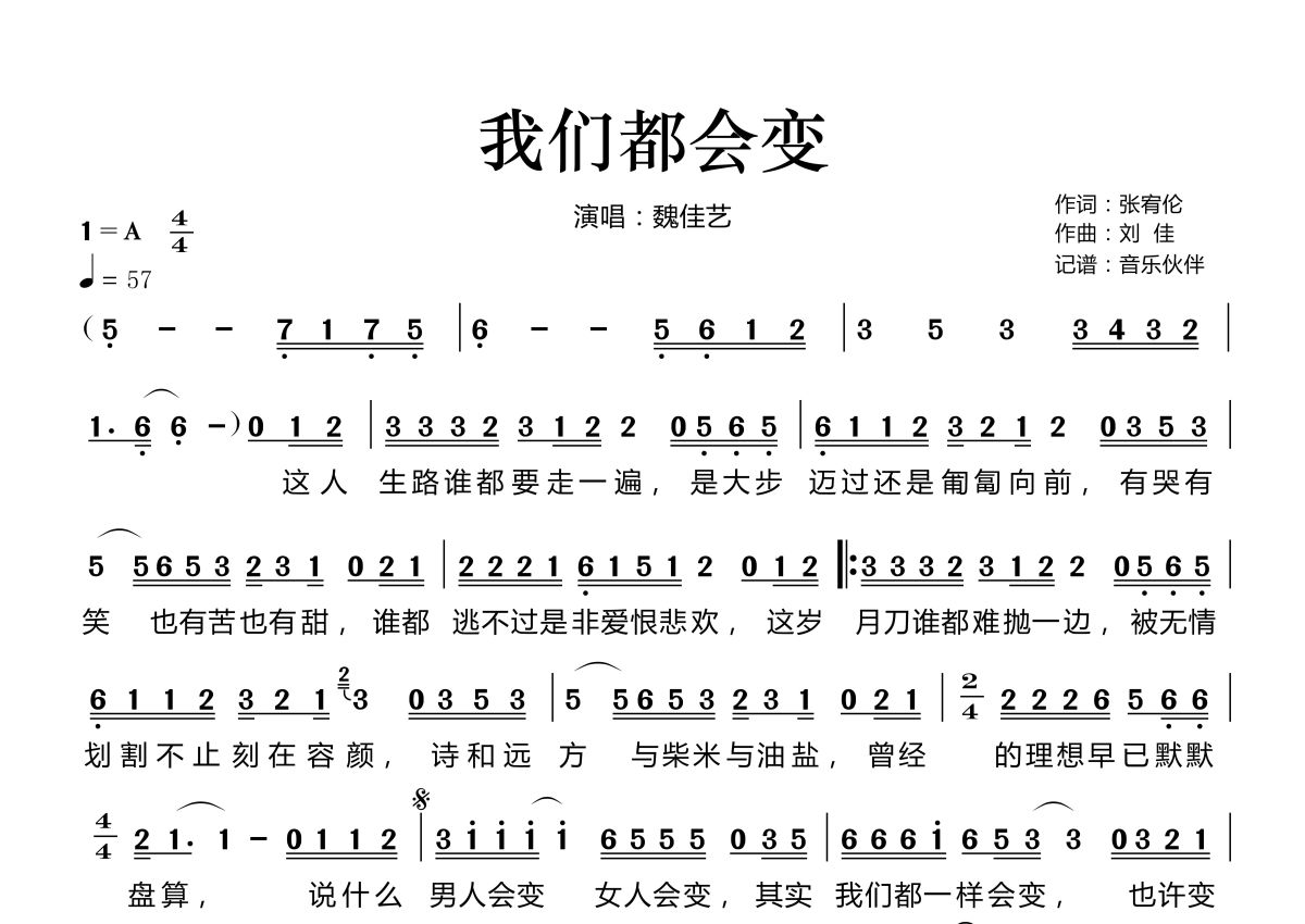 《我们都会变》是魏佳艺演唱的一首歌曲,拍号为4/4拍,歌曲速度为每分钟57拍,这份简谱共有一张高清图谱,图谱由 @音乐伙伴 编配上传。
