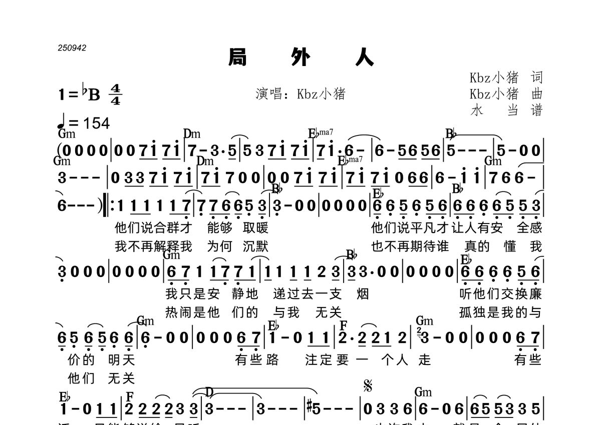 《局外人》是Kbz小猪演唱的一首歌曲,标和弦版,拍号为4/4拍,歌曲速度为每分钟154拍,这份简谱共有两张高清图谱,图谱由 @水当 编配上传标原版和弦,加未标版一并上传。