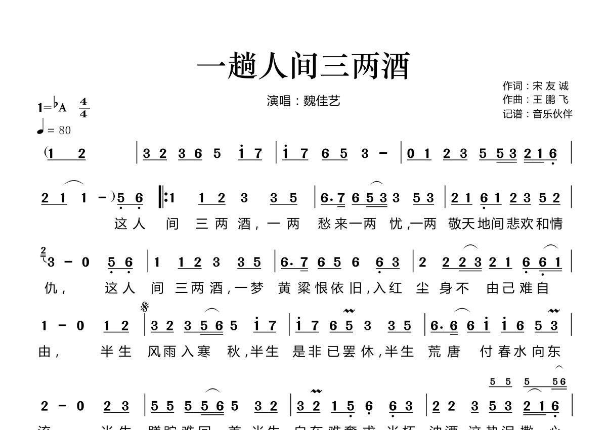 一趟人间三两酒简谱 - 魏佳艺演唱
