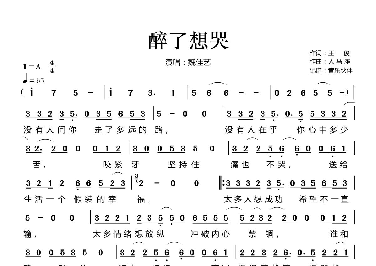 《醉了想哭》是魏佳艺演唱的一首歌曲,拍号为4/4拍,歌曲速度为每分钟65拍,这份简谱共有一张高清图谱,图谱由 @音乐伙伴 编配上传。