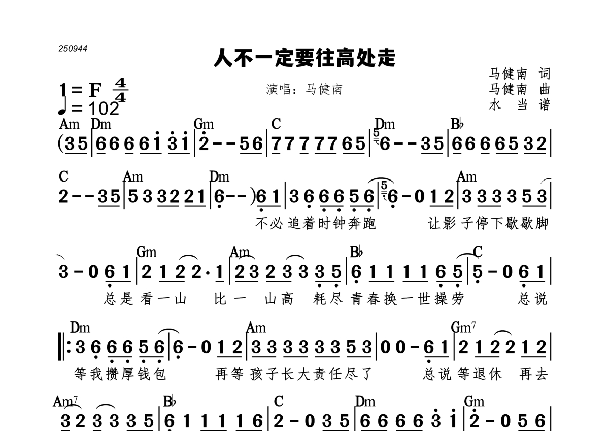 《人不一定要往高处走》是马健南演唱的一首歌曲,标注和弦版,拍号为4/4拍,歌曲速度为每分钟102拍,这份简谱共有两张高清图谱,图谱由 @水当 编配上传标原版和弦,一并上传未标版,对比使用。