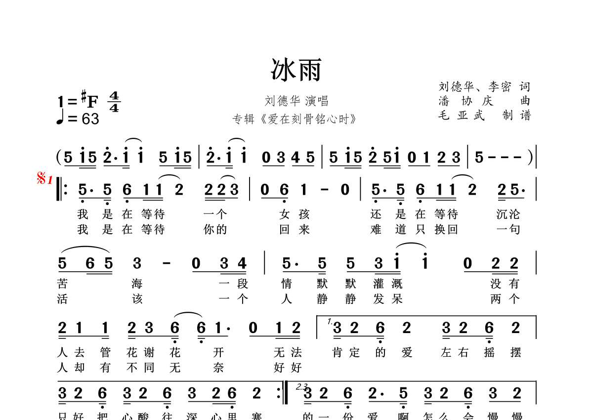冰雨简谱 - 刘德华演唱