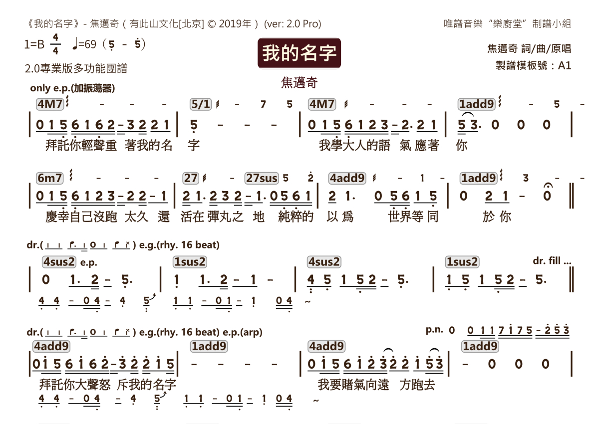 “乐厨堂”乐谱发布小组: 出版级乐谱扒谱制谱——以职业乐手圈通行标准记谱,遵循原版和声、伴奏元素和段落结构。 ❶ 2.0多功能专业团谱:采用台湾卓著公司开创的二代简谱标准制作。二代简谱无疑是迄今为止最科学、最易读的专业范畴多功能记谱方案:❷ 框架谱:采用职业乐手通常记谱方案制作。