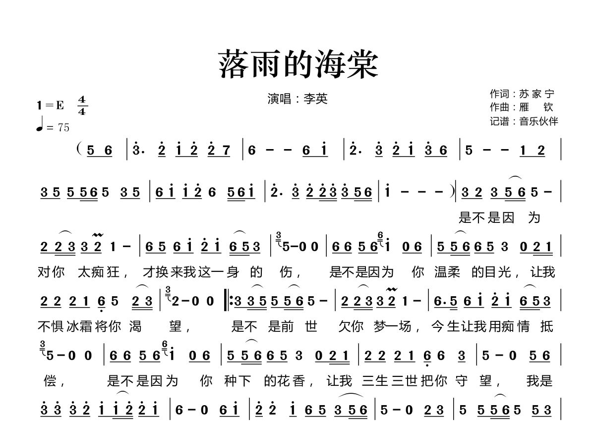 《落雨的海棠》是李英演唱的一首歌曲,拍号为4/4拍,歌曲速度为每分钟75拍,这份简谱共有一张高清图谱,图谱由 @音乐伙伴 编配上传。