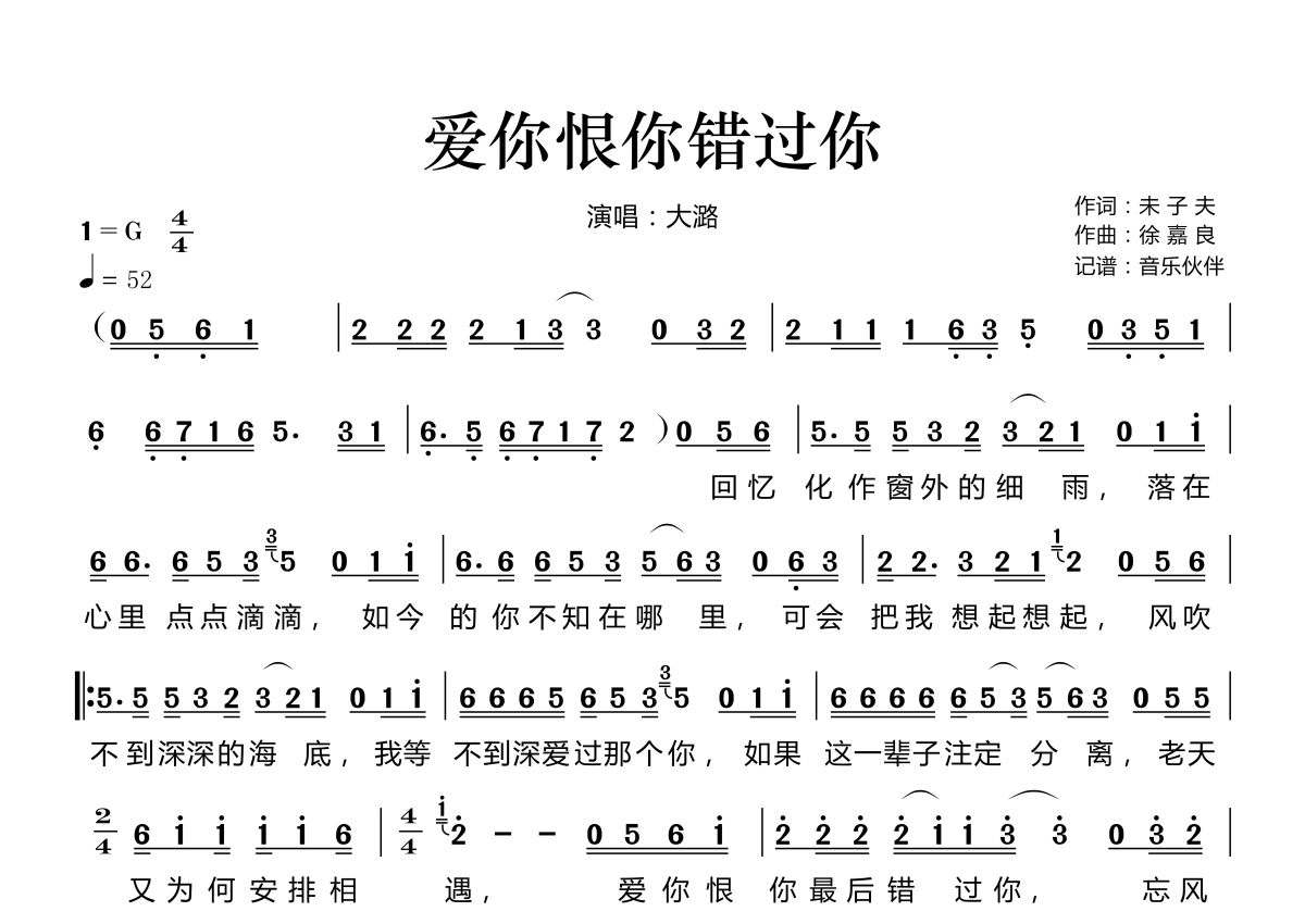 《爱你恨你错过你》是大潞演唱的一首歌曲,拍号为4/4拍,歌曲速度为每分钟52拍,这份简谱共有一张高清图谱,图谱由 @音乐伙伴 编配上传。