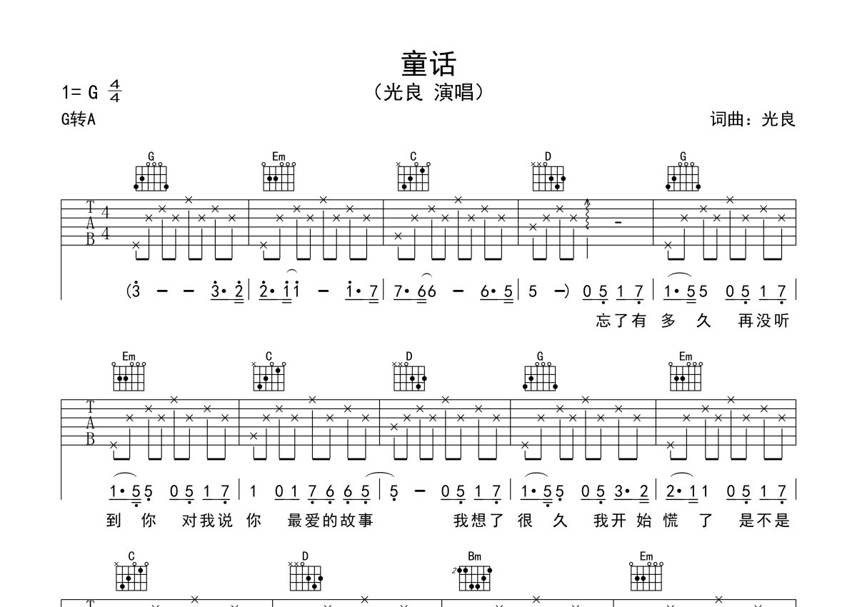 光良《童话》吉他谱 - G调弹唱六线谱 - 新手简单版
