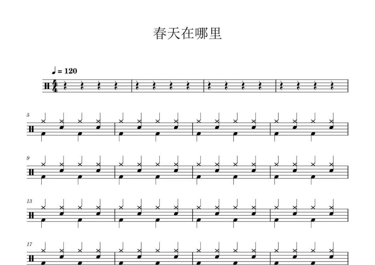 《春天在哪里》是儿童歌曲演唱的一首歌曲,拍号为4/4拍,歌曲速度为每分钟120拍,这份架子鼓谱共有两张高清图谱,图谱由 @音符喷血者 编配上传,图谱使用五线谱编配,使用这份春天在哪里架子鼓谱,你将能够轻松地敲打出这首儿童歌曲的春天在哪里,快来尝试吧。