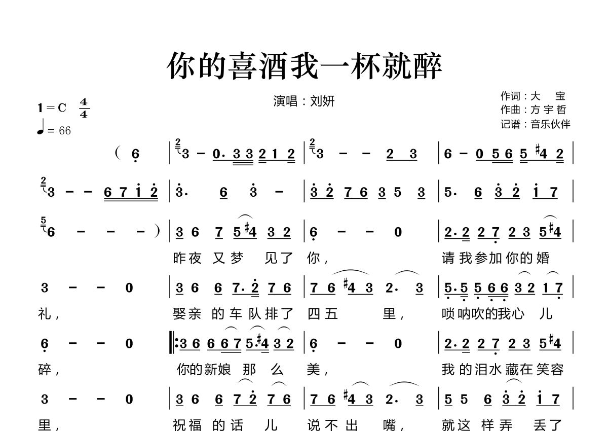 《你的喜酒我一杯就醉》是刘妍演唱的一首歌曲,拍号为4/4拍,歌曲速度为每分钟66拍,这份简谱共有一张高清图谱,图谱由 @音乐伙伴 编配上传。