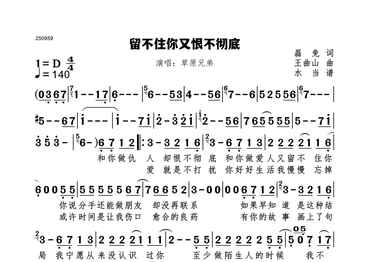 《留不住你又恨不彻底》是草原兄弟演唱的一首歌曲,拍号为4/4拍,歌曲速度为每分钟140拍,这份简谱共有一张高清图谱,图谱由 @水当 编配上传。