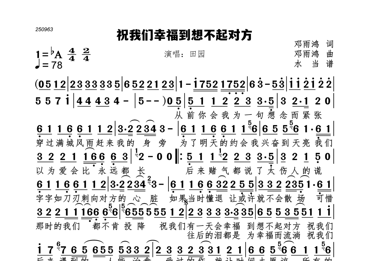 《祝我们幸福到想不起对方》是田园演唱的一首歌曲,拍号为4/4拍,歌曲速度为每分钟78拍,这份简谱共有一张高清图谱,图谱由 @水当 编配上传。