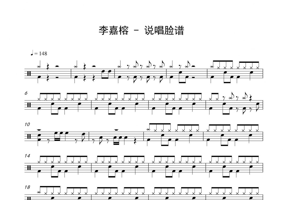 《说唱脸谱》是李嘉榕演唱的一首歌曲,拍号为4/4拍,歌曲速度为每分钟148拍,这份架子鼓谱共有两张高清图谱,图谱由 @音符喷血者 编配上传,图谱使用五线谱编配,使用这份说唱脸谱架子鼓谱,你将能够轻松地敲打出这首李嘉榕的说唱脸谱,快来尝试吧。
