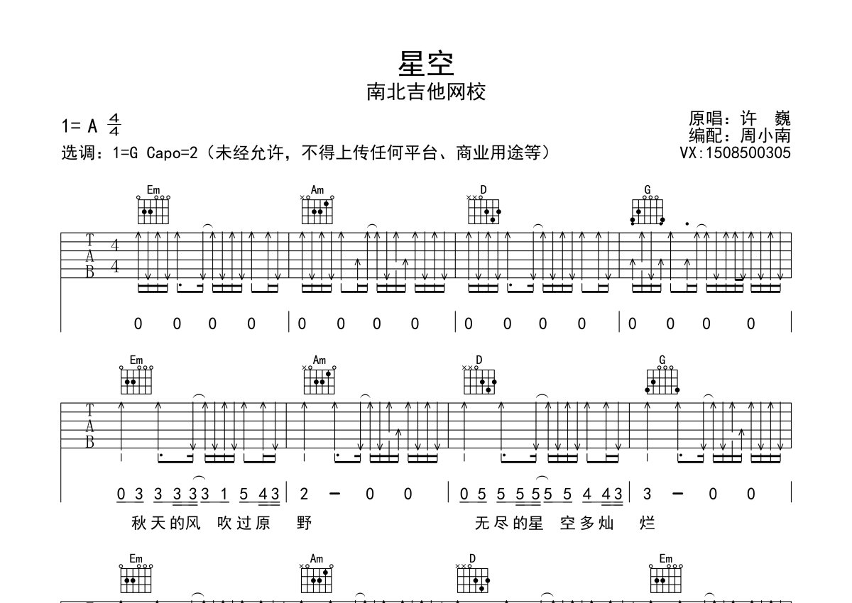 《星空》是许巍演唱的一首歌曲,完美版,本吉他谱采用的是G调指法编配,这份吉他谱共有两张高清图谱,图谱由 @南北吉他网校 编配上传,图谱使用六线谱编配,包含吉他和弦指法、简谱以及歌词部分,曲谱配备了相关的视频提供浏览,使用这份星空吉他谱,可以让你更加方便地掌握这首歌曲的弹唱技巧,快来尝试吧。1.伴奏丰富多变,给你不一样的弹唱体验...2.用到反方向扫弦、三十二分音符等......。