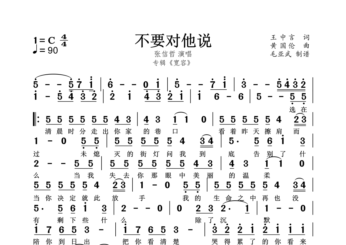 《不要对他说》是张信哲演唱的一首歌曲,拍号为4/4拍,这份简谱共有一张高清图谱,图谱由 @秋天的童话 编配上传。
