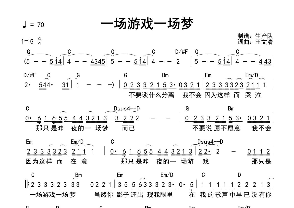 《一场游戏一场梦(和弦谱)》是和弦谱演唱的一首歌曲,和弦谱,这份简谱共有一张高清图谱,图谱由 @生产队 编配上传王杰演唱的经典歌曲《一场游戏一场梦》和弦弹唱谱。