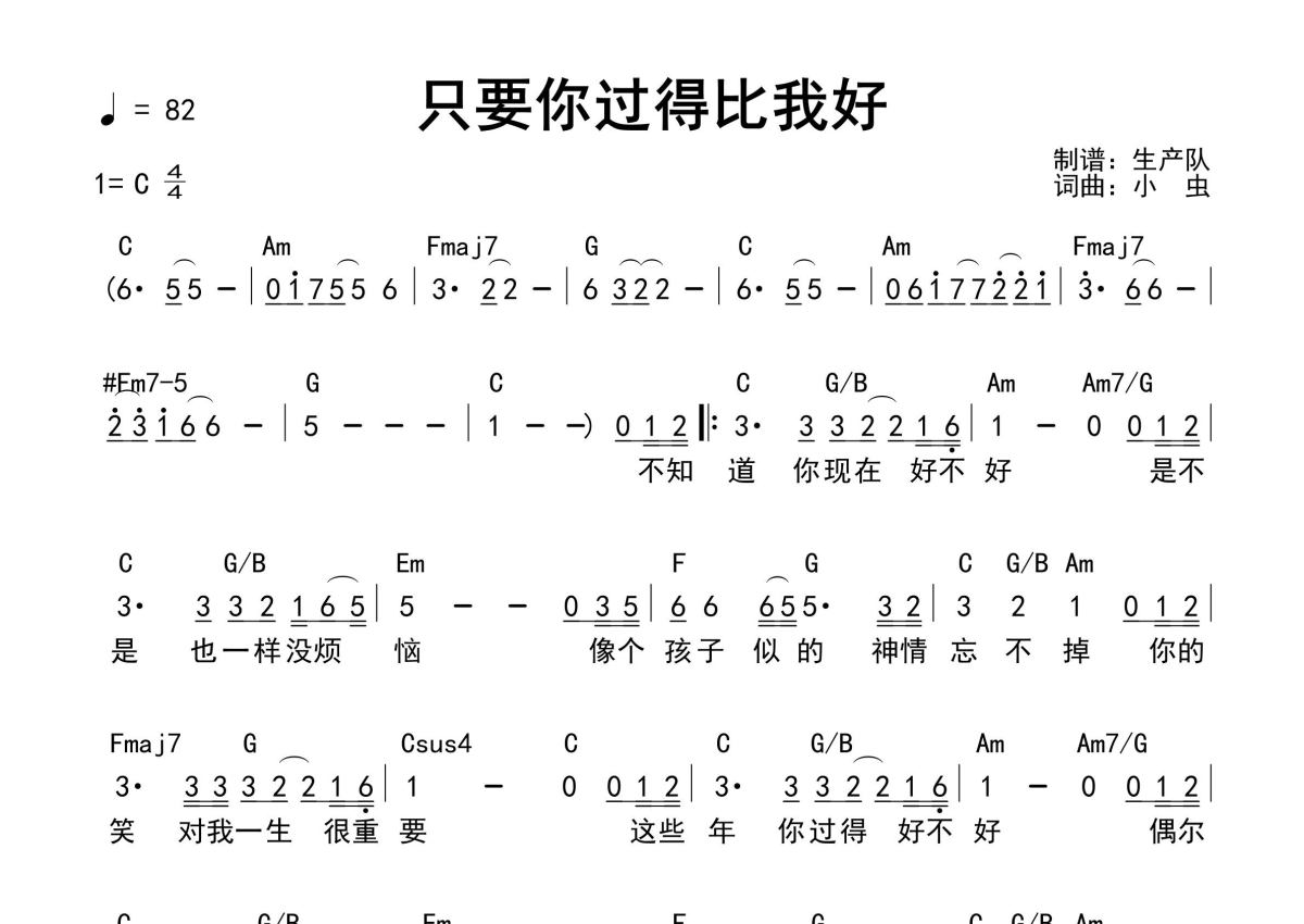 《只要你过得比我好(和弦谱)》是和弦谱演唱的一首歌曲,和弦谱,这份简谱共有一张高清图谱,图谱由 @生产队 编配上传钟镇涛演唱的经典歌曲《只要你过得比我好》和弦弹唱谱。