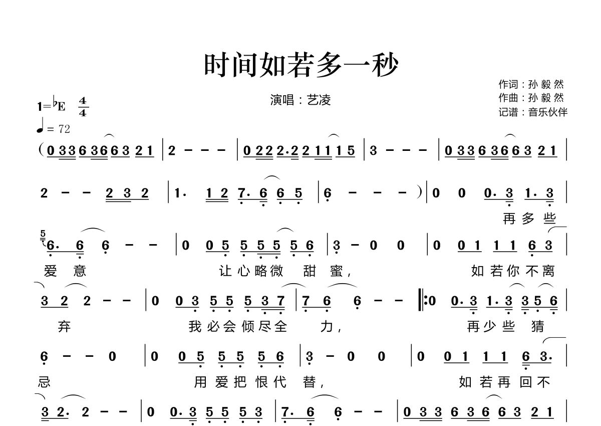 《时间如若多一秒》是艺凌演唱的一首歌曲,拍号为4/4拍,歌曲速度为每分钟72拍,这份简谱共有一张高清图谱,图谱由 @音乐伙伴 编配上传。