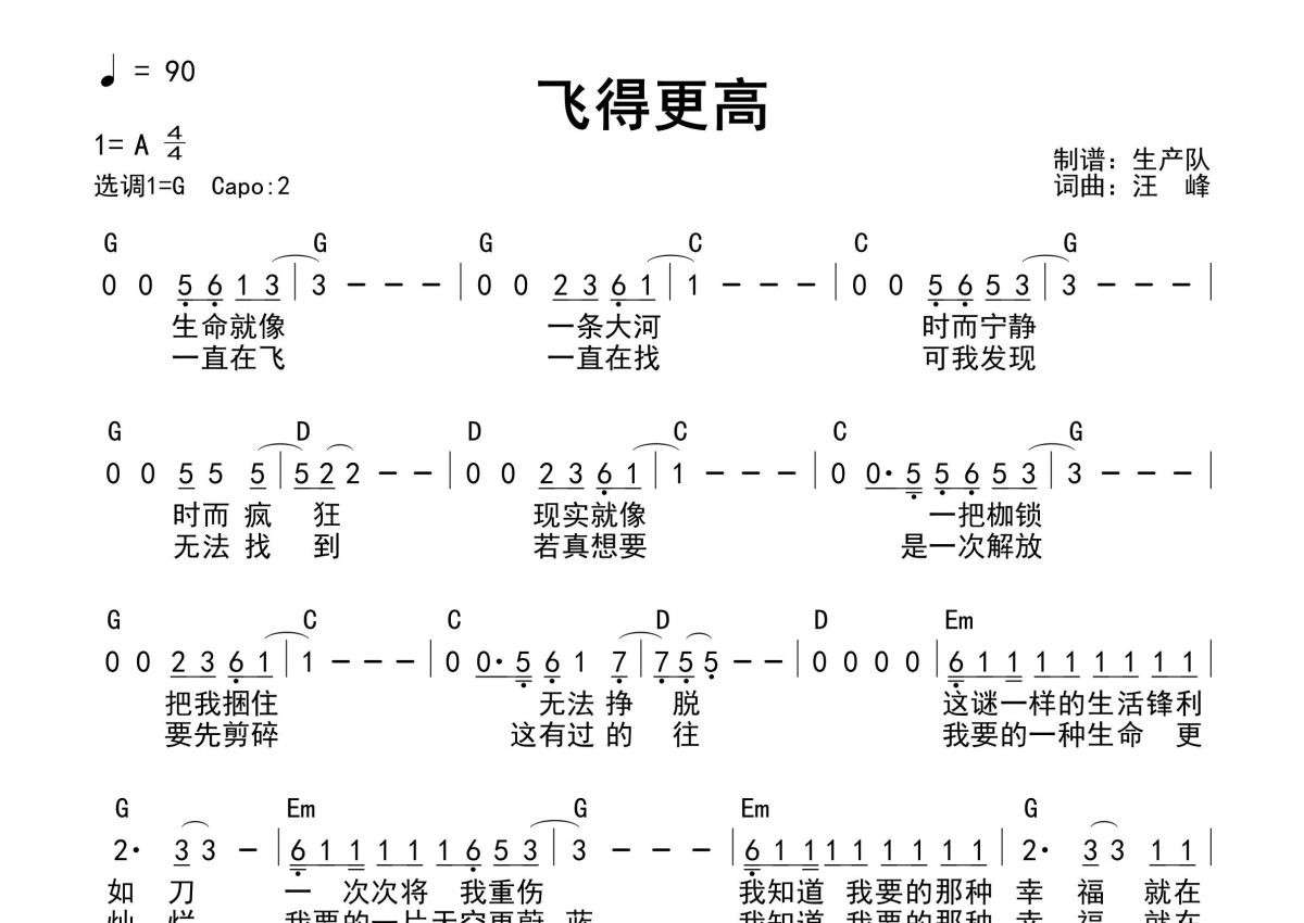 《飞得更高(和弦谱)》是和弦谱演唱的一首歌曲,和弦谱,这份简谱共有一张高清图谱,图谱由 @生产队 编配上传汪峰演唱的经典歌曲《飞得更高》和弦弹唱谱。