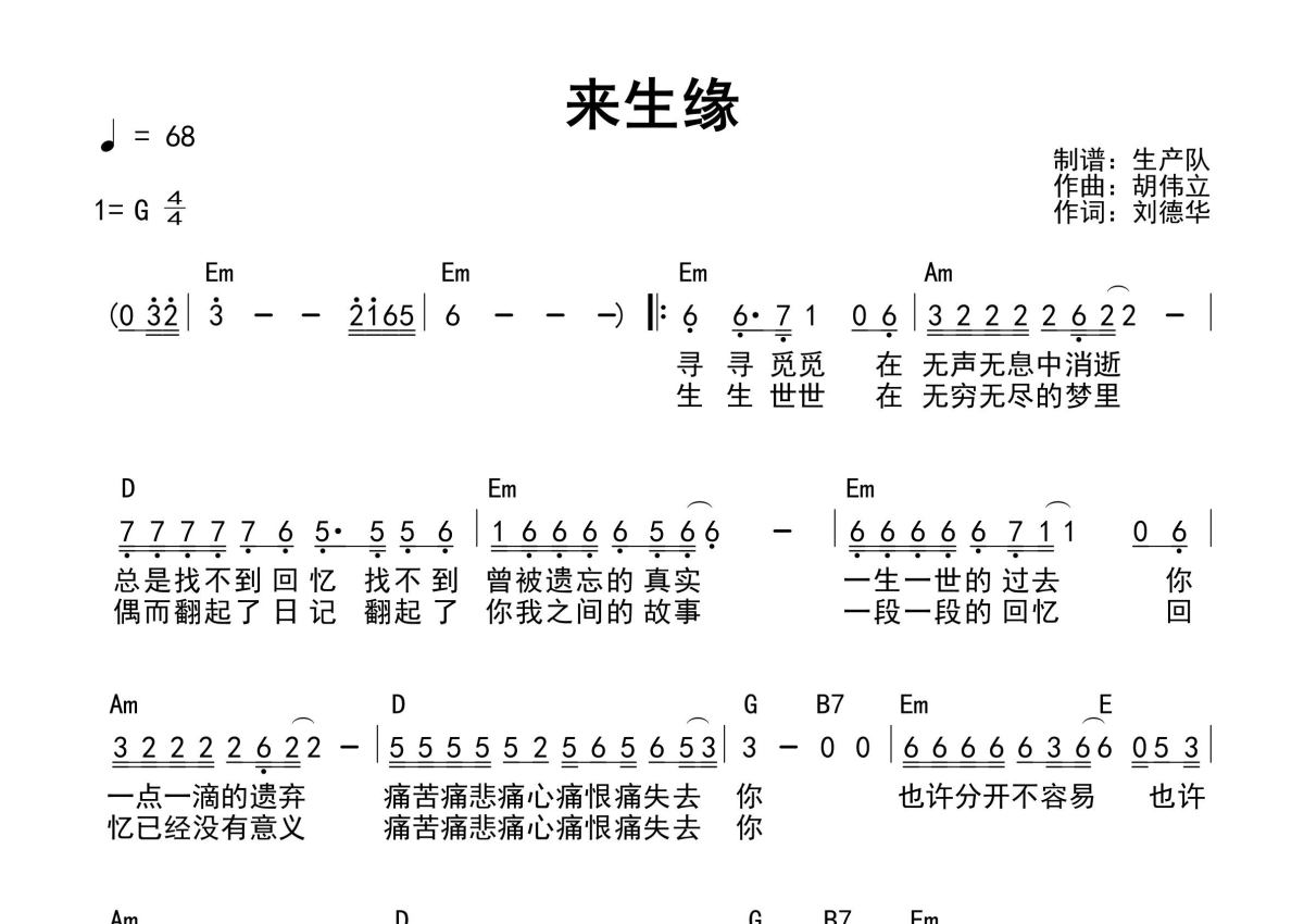 《来生缘(和弦谱)》是和弦谱演唱的一首歌曲,和弦谱,这份简谱共有一张高清图谱,图谱由 @生产队 编配上传刘德华演唱的经典歌曲《来生缘》和弦弹唱谱。