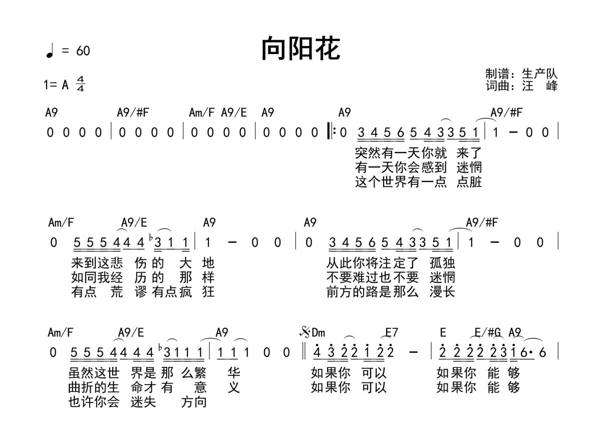 《向阳花(和弦谱)》是和弦谱演唱的一首歌曲,和弦谱,这份简谱共有一张高清图谱,图谱由 @生产队 编配上传汪峰演唱的经典歌曲《向阳花》和弦弹唱谱。