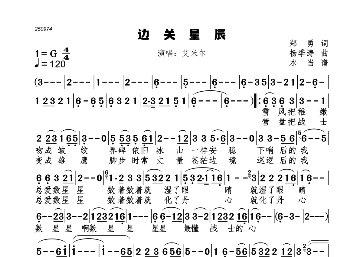 边关星辰简谱 - 艾米尔演唱