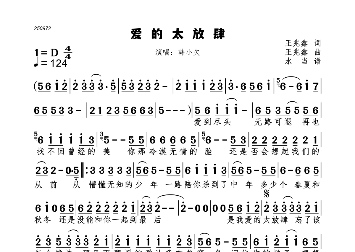 爱的太放肆简谱 - 韩小欠演唱