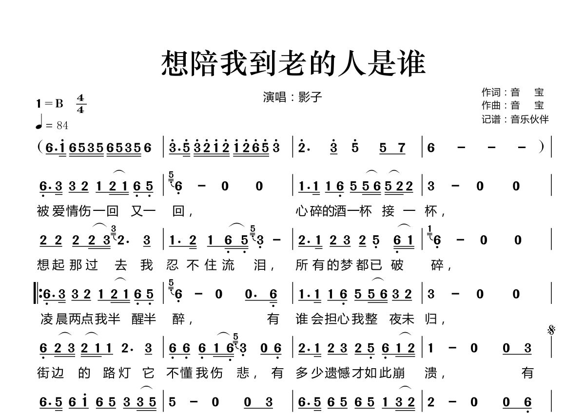 《想陪我到老的人是谁》是影子演唱的一首歌曲,拍号为4/4拍,歌曲速度为每分钟84拍,这份简谱共有一张高清图谱,图谱由 @音乐伙伴 编配上传。