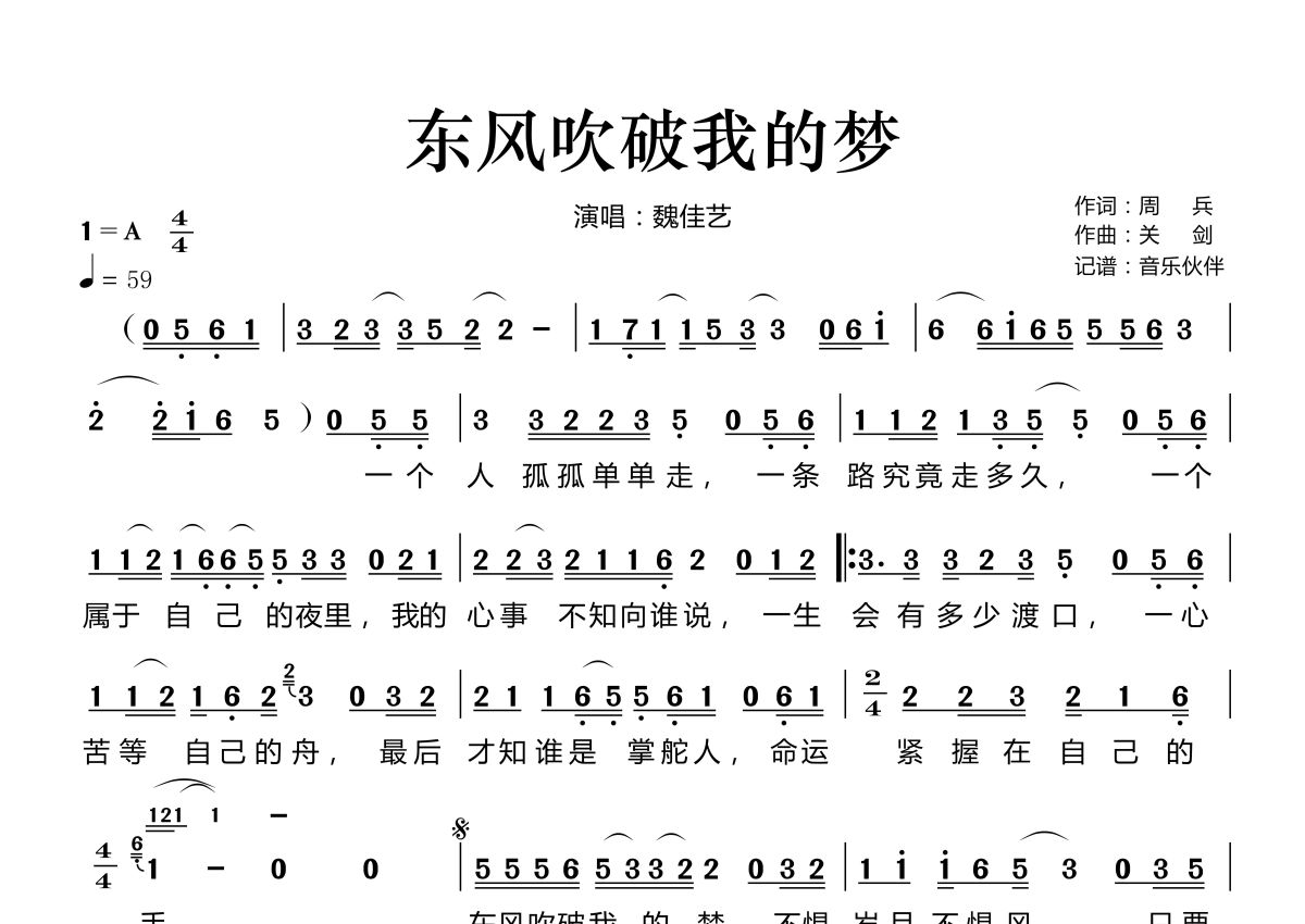 东风吹破我的梦简谱 - 魏佳艺演唱