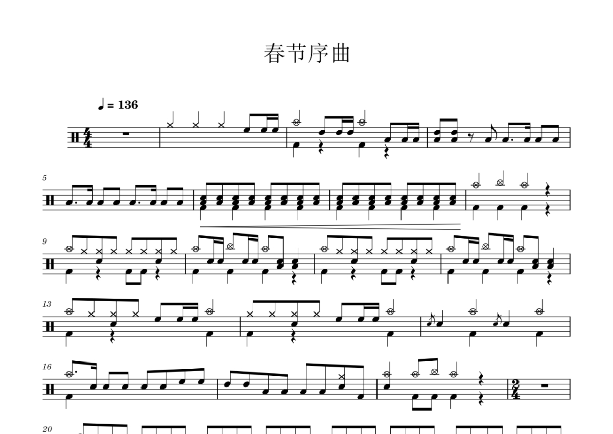 《春节序曲》是摇滚风格演唱的一首歌曲,拍号为4/4拍,歌曲速度为每分钟136拍,这份架子鼓谱共有两张高清图谱,图谱由 @音符喷血者 编配上传,图谱使用五线谱编配,使用这份春节序曲架子鼓谱,你将能够轻松地敲打出这首摇滚风格的春节序曲,快来尝试吧。