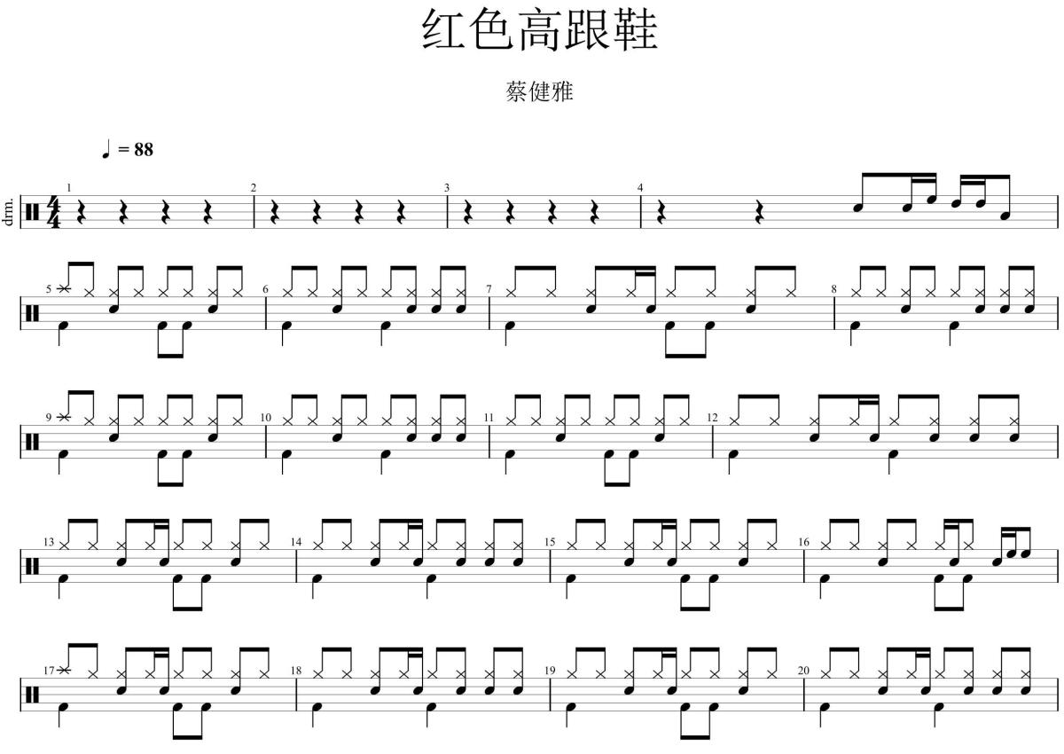 《红色高跟鞋》是蔡健雅演唱的一首歌曲,拍号为4/4拍,歌曲速度为每分钟88拍,这份架子鼓谱共有两张高清图谱,图谱由 @鼓动飞扬 编配上传,图谱使用五线谱编配,使用这份红色高跟鞋架子鼓谱,你将能够轻松地敲打出这首蔡健雅的红色高跟鞋,快来尝试吧。