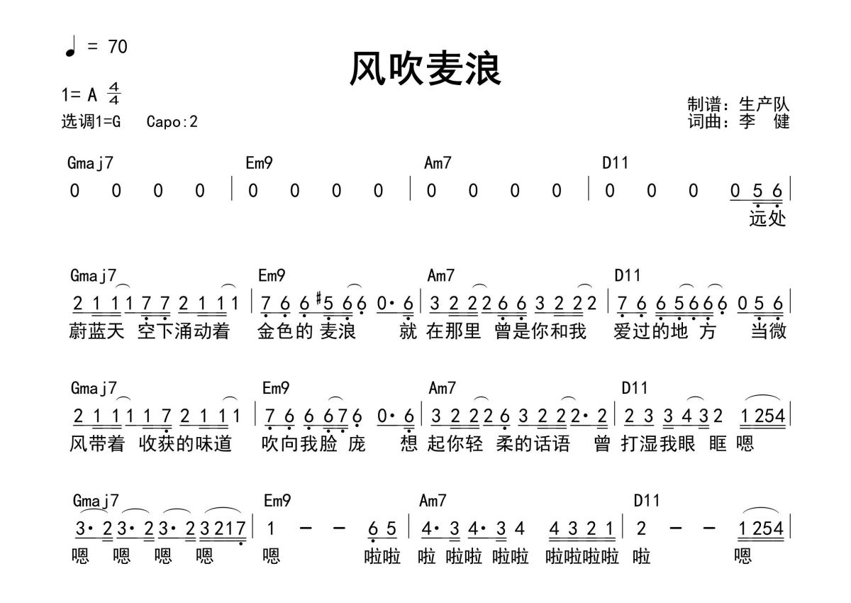 《风吹麦浪(和弦谱)》是和弦谱演唱的一首歌曲,和弦谱,这份简谱共有一张高清图谱,图谱由 @生产队 编配上传李健演唱的经典歌曲《风吹麦浪》和弦弹唱谱。