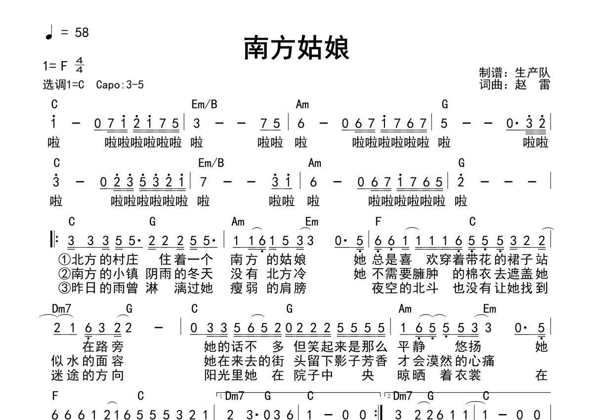 《南方姑娘(和弦谱)》是和弦谱演唱的一首歌曲,和弦谱,这份简谱共有一张高清图谱,图谱由 @生产队 编配上传赵雷演唱的经典歌曲《南方姑娘》和弦弹唱谱。