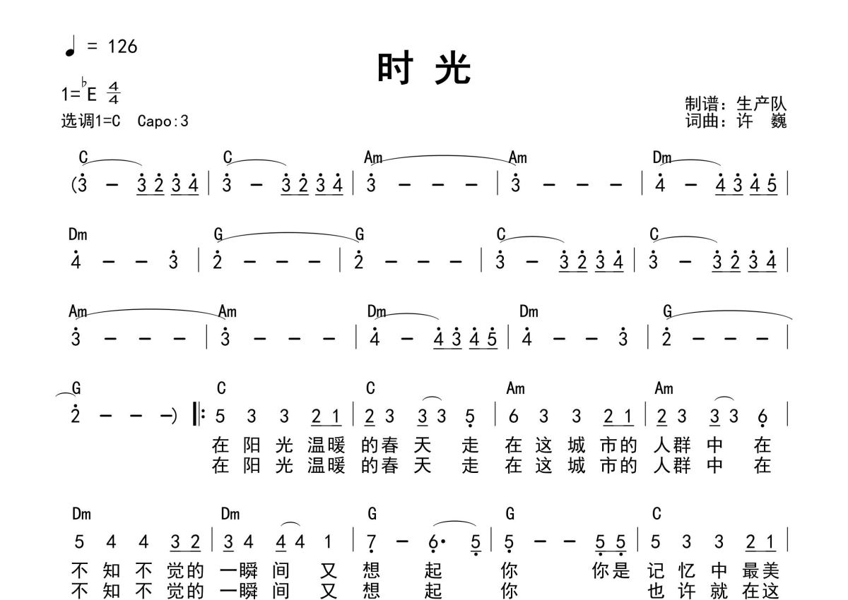 《时光(和弦谱)》是和弦谱演唱的一首歌曲,和弦谱,这份简谱共有一张高清图谱,图谱由 @生产队 编配上传许巍演唱的经典歌曲《时光》和弦弹唱谱。