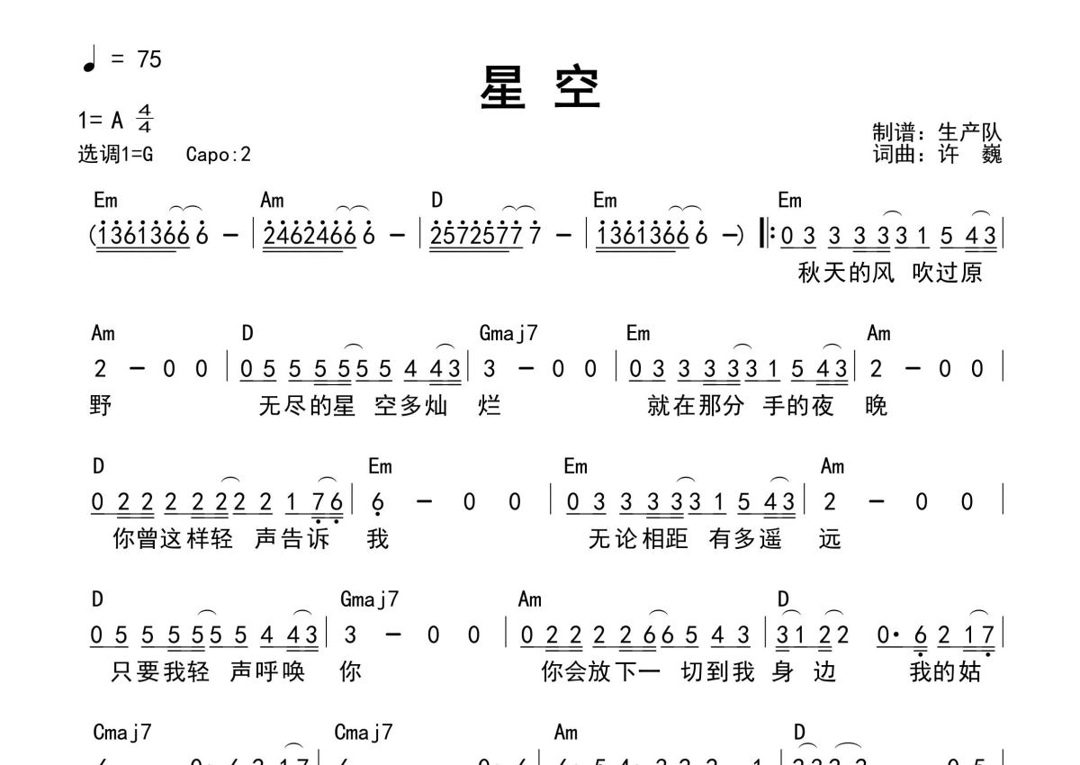 《星空(和弦谱)》是和弦谱演唱的一首歌曲,和弦谱,这份简谱共有一张高清图谱,图谱由 @生产队 编配上传许巍演唱的经典歌曲《星空》和弦弹唱谱。