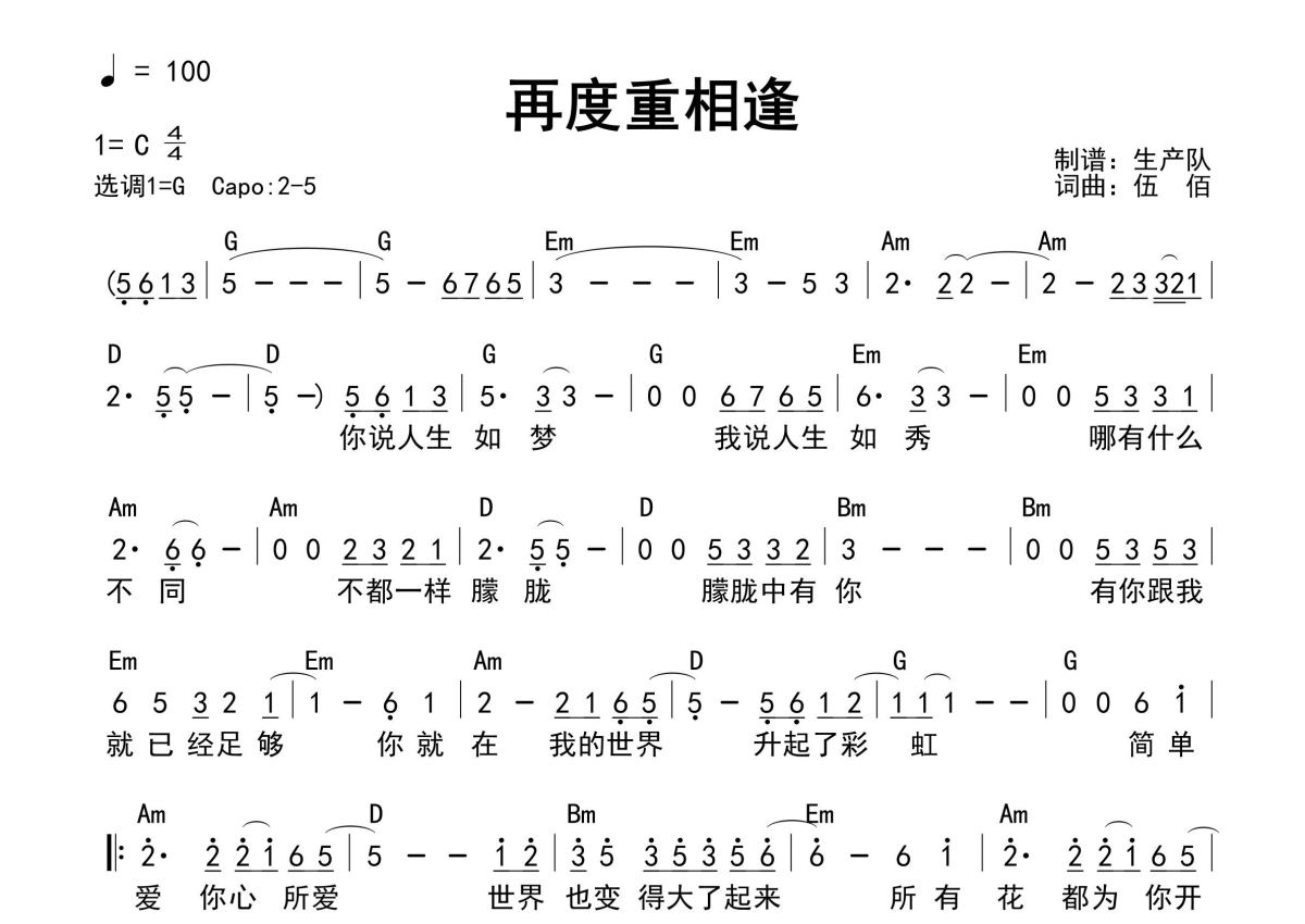 《再度重相逢(和弦谱)》是和弦谱演唱的一首歌曲,和弦谱,这份简谱共有一张高清图谱,图谱由 @生产队 编配上传伍佰演唱的经典歌曲《再度重相逢》和弦弹唱谱。
