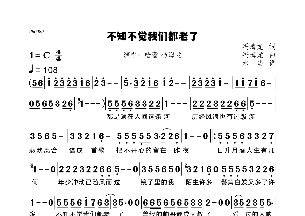 《不知不觉我们都老了》是哈蕾 冯海龙演唱的一首歌曲,拍号为4/4拍,歌曲速度为每分钟108拍,这份简谱共有一张高清图谱,图谱由 @水当 编配上传。