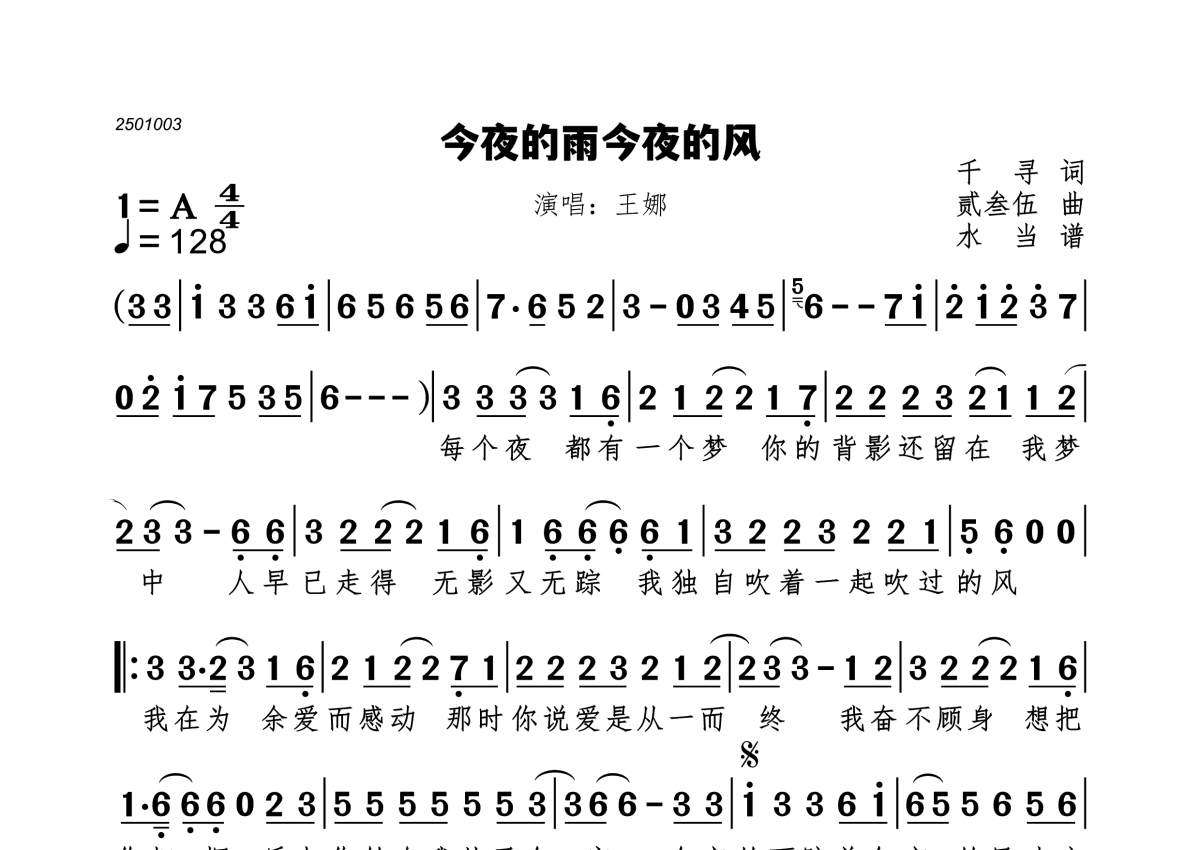 今夜的雨今夜的风简谱 - 王娜演唱