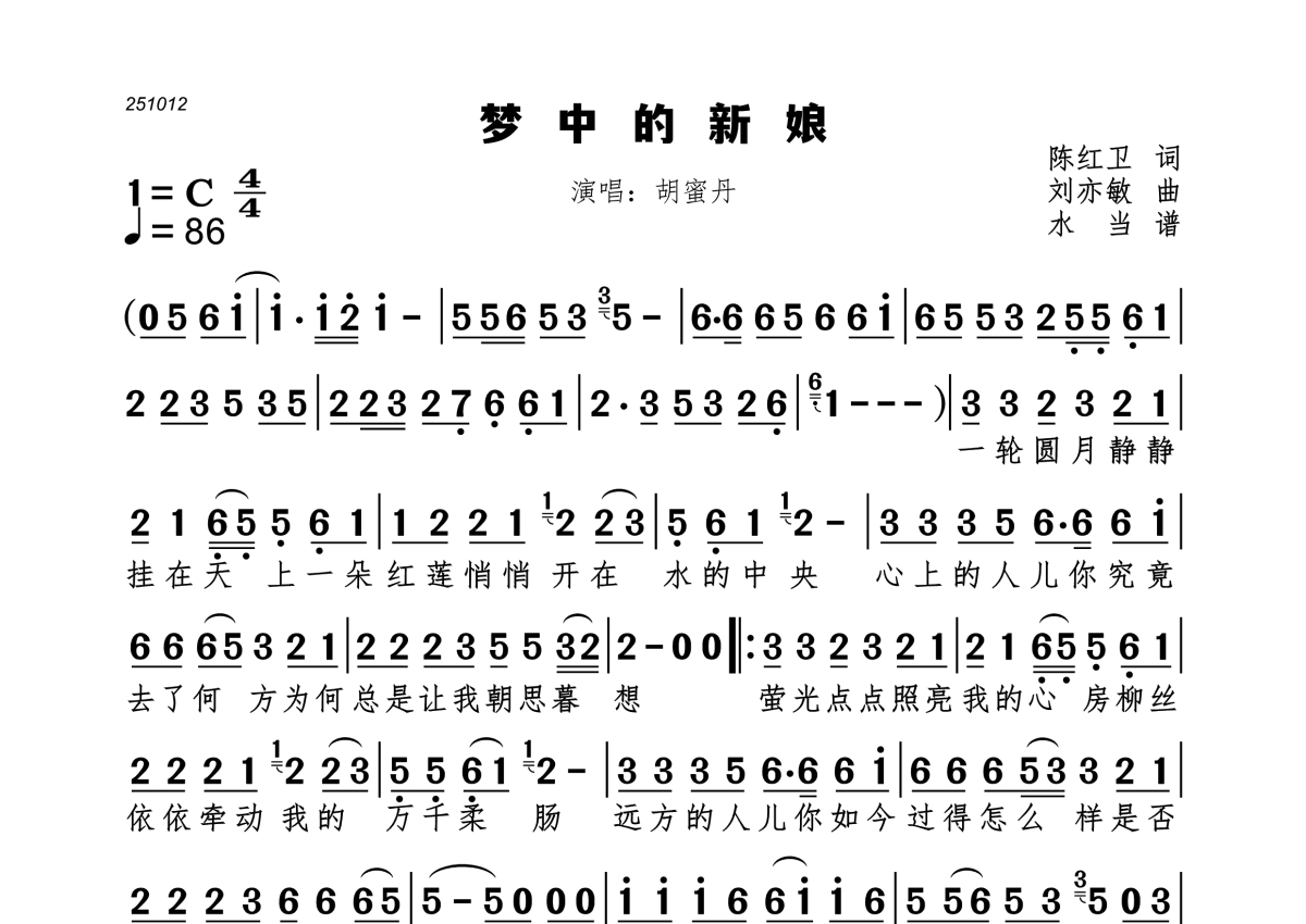《梦中的新娘》是胡蜜丹演唱的一首歌曲,拍号为4/4拍,歌曲速度为每分钟86拍,这份简谱共有一张高清图谱,图谱由 @水当 编配上传。