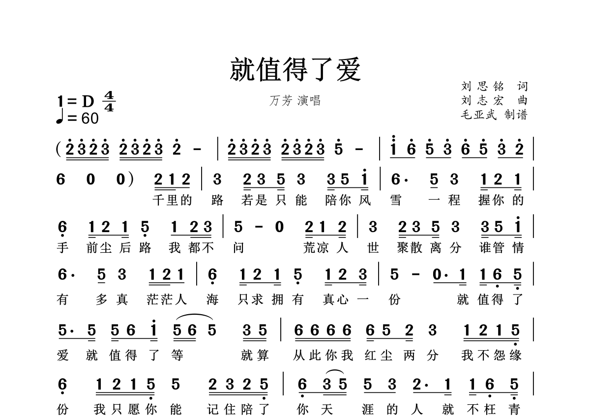 《就值得了爱》是万芳演唱的一首歌曲,拍号为4/4拍,这份简谱共有两张高清图谱,图谱由 @秋天的童话 编配上传。