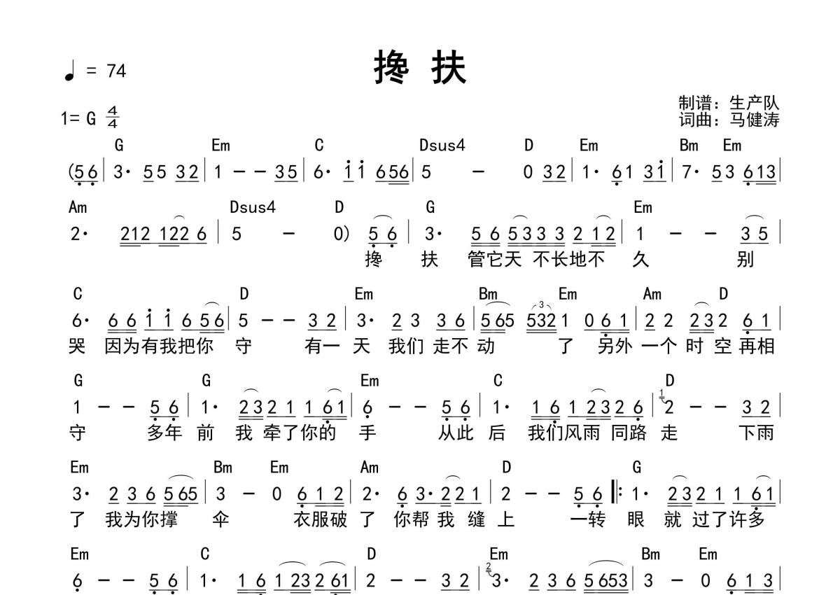 《搀扶(和弦谱)》是和弦谱演唱的一首歌曲,和弦弹唱谱,拍号为4/4拍,歌曲速度为每分钟74拍,这份简谱共有一张高清图谱,图谱由 @生产队 编配上传马健涛演唱的经典歌曲《搀扶》和弦弹唱谱,免翻页编配。